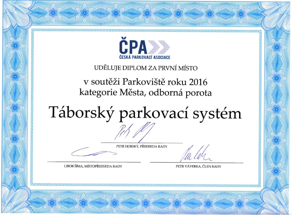 V rámci konference České parkovací asociace dne 26. dubna 2017 proběhlo vyhlášení prvního ročníku soutěže Parkoviště roku. Konference byla realizována pod záštitou Svazu měst a obcí a jako hlavní partner byl Státní fond dopravní infrastruktury. V kategorii Městská parkovací politika zvítězil v odborné porotě i v hlasování veřejnosti „Táborský parkovací systém“. Město Tábor porotu zaujalo […]